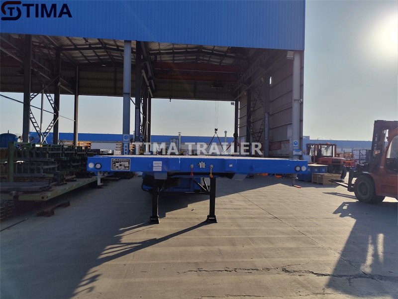 السرير المسطح تم تجهيز المقطورة بثلاثة محاور، متباعدة بشكل متساو على طول المقطورة. يوفر هذا التكوين زيادة في قدرة التحمل والاستقرار، مما يجعله مناسبًا لحمل الحاويات الثقيلة والبضائع السائبة. تم دمج الأقفال الملتوية في سطح المقطورة، والتي تعمل على تأمين الحاويات وقفلها في مكانها أثناء النقل.